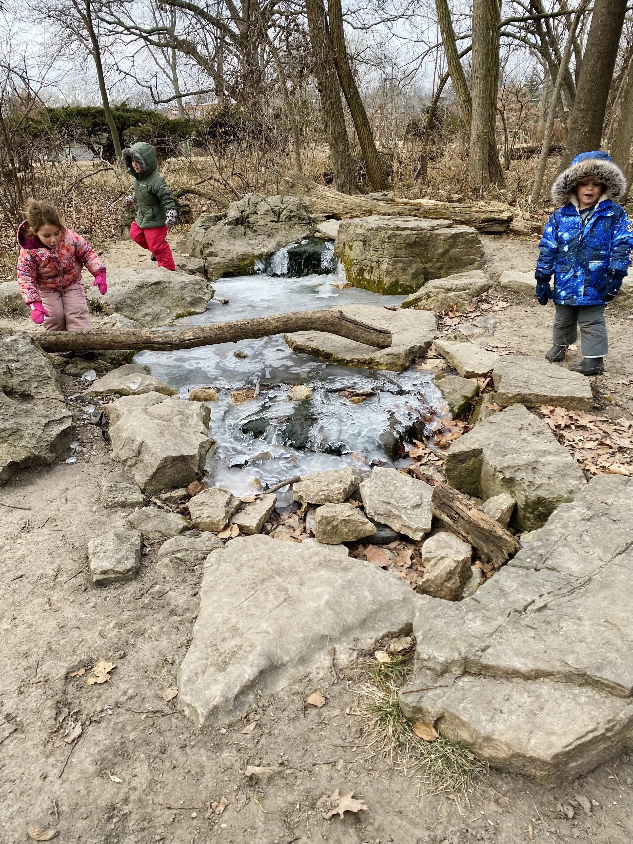 We spent the morning: building homes for our dollhouse people, making a cake from scratch, and then exploring the ice in the pond at the Bird Sanctuary.